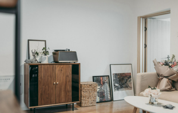 거실 수납을 용이하게 하기 위해서 통나무로 만들어진 수납장을 사용하고 있습니다. 바닥보다 조금 더두운 색상을 선택하여 차분하고 정돈된 느낌을 줍니다. 턴테이블과 바구니, 액자 등을 바닥에 나란히 배치하여 감성이 돋보입니다.