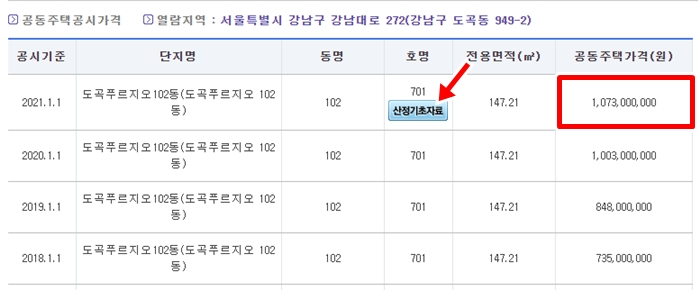 예를 들어 조회해본 아파트 공시지가 조회 내용입니다. 매년 1월 1일 발표된 공동주택가격이 오른쪽에 나와있습니다. 2021년 올해의 경우 10억 7,300만원으로 책정되어 있습니다. 매년 높아지고 있기 때문에 2022년이 되면 또 새로운 가격을 확인 할 수 있습니다.