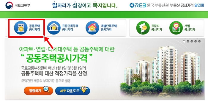 아파트 공시지가 조회는 국토교통부에서 제공하고 있습니다. 따라서 '부동산 공시가격 알리미'사이트에 들어가면 토지, 개별단독주택, 표준단독주택, 공동주택 등의 공시가격을 모두 확인할 수 있습니다.