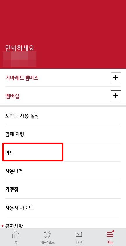 앱의 메뉴로 가면 결제 차량과 카드를 확인할 수 있습니다.